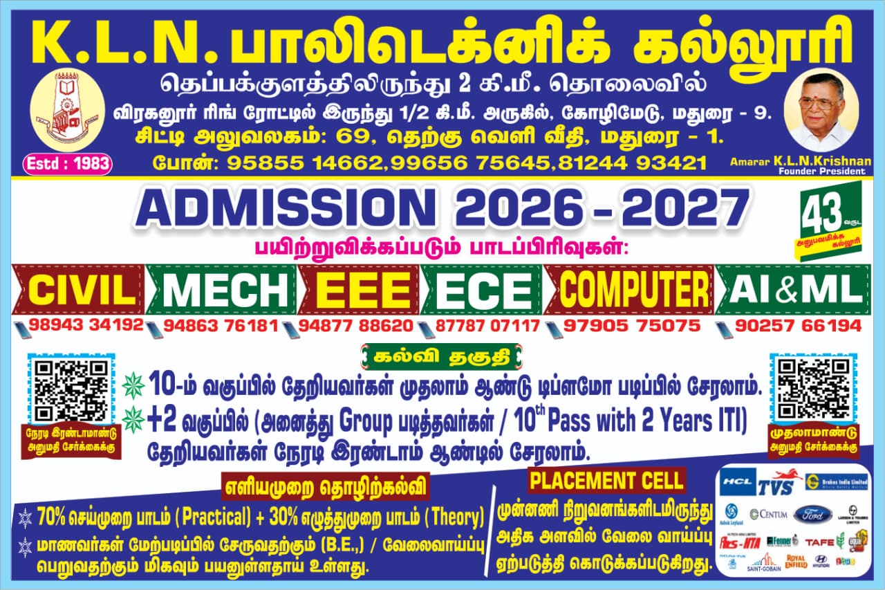 All courses offered by our Polytechnic are approved by AICTE,New Delhi and affiliated by Directorate of Technical Education,Chennai. Our college has collaboration with most of the Engineering Industries and other Industries around Madurai. All Six Departments are headed by eminent,dedicated and sincere Professors with qualification in their appropriate branch of engineering and technology. Each branch has student faculty ratio according to AICTE norms. The faculty members are well groomed with up-to-date Technology in Technical Teaching to motivate the students to learn the modern trend in Engineering and Technology. Our Polytechnic has the highest intake of 420 students in first year in and around Madurai.